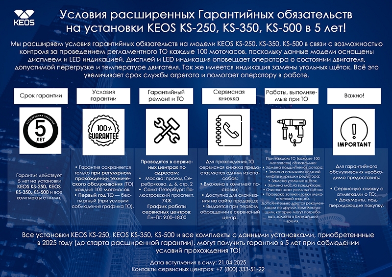 - Мы расширяем условия гарантийных обязательств на модели Keos KS-250, KS-350, KS-500 в связи с возможностью контроля за проведением регламентного ТО каждые 100 моточасов, поскольку данный модели оснащены дисплеем и LED индикацией