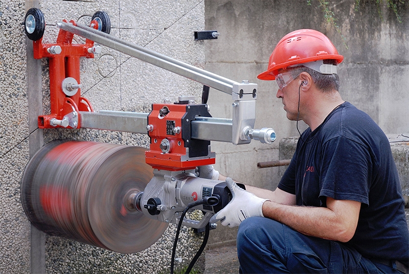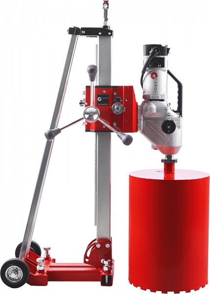 Установка алмазного бурения Cardi 501 (Карди 501) предназначена для сверления отверстий Ø 25 – 500 мм в бетоне, железобетоне, асфальте, кирпиче под углом 0° – 75° с обязательной подачей воды.